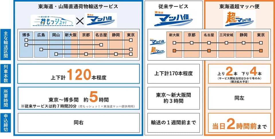 JR西日本が山陽新幹線で提供している「荷もっシュッ!」と連携し、新大阪駅での載せ替えを不要とする。これにより、東京~博多間の所要時間は現行の約7時間20分から約5時間に短縮する。