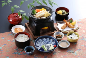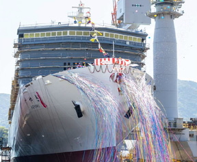 新門司港に到着後、小倉で1泊し三菱重工業 下関造船所で新日本海フェリーの新造船の進水式を見学。船が船台を滑り降りる迫力のある光景を見たあとは、昼食に下関名物のふく刺身とふく胸板焼き膳を味わう。