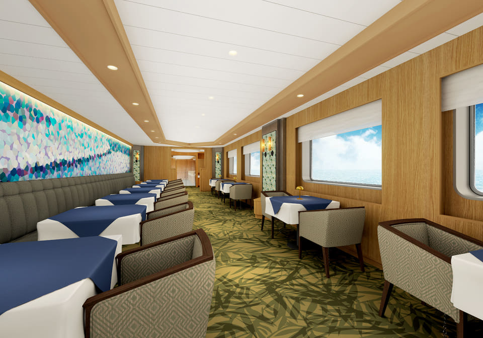 けやきは京都・歴史をコンセプトに、上品で優雅な温かみのある船内デザインを追求。コース料理を提供するグリルレストラン「大江山」、層吹き抜けのフォワードサロン「白竜」など、随所に京都や丹後ゆかりの名称や意匠を取り入れている。