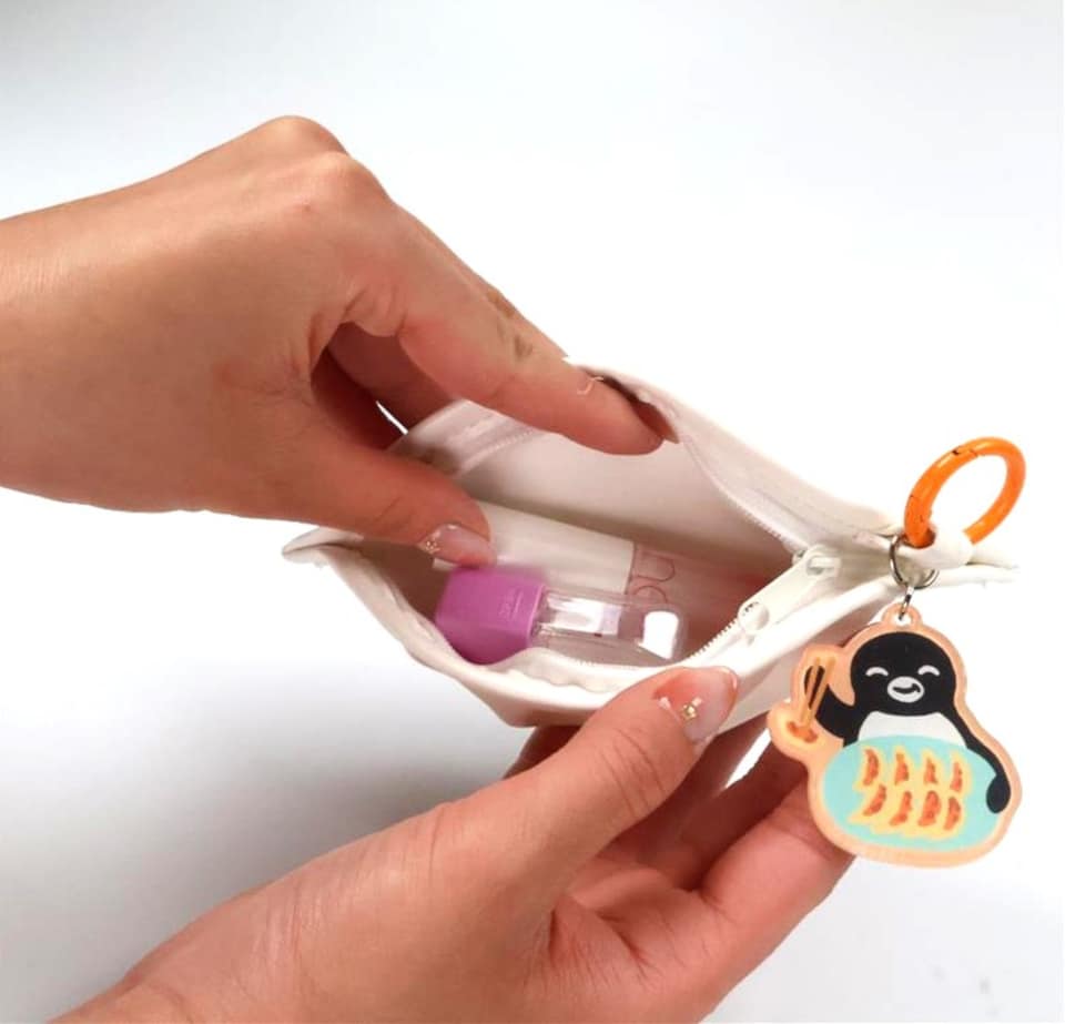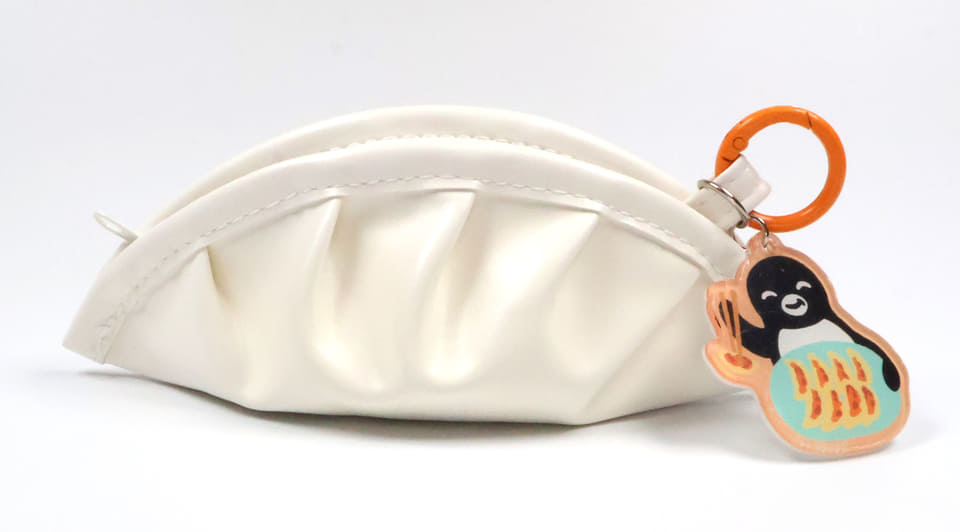 栃木名物の餃子をモチーフにしたミニポーチで、サイズは約16×7.5cm。付属のアクリルチャームは、美味しそうな餃子を前ににっこりとほほ笑む「Suicaのペンギン」がポイントになっている。カラビナ付きなので、リップや目薬などの小物をポーチに入れて手持ちのバッグにぶら下げることも可能。