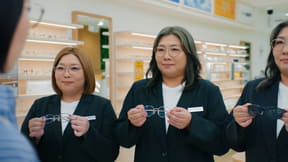 やすともが“分身”して接客するOWNDAYSの新CM。着用メガネは海原やすよさんが「Graph Belle(GB2046G-5S)」(C3グレージュ)、海原ともこさんが「John Dillinger(JD1049X-5S)」(C3シルバー) 海原やすよさん着用「GB2046G-5S C3 グレージュ」(1万1000円) 海原ともこさん着用「JD1049X-5S C3 シルバー」(1万5000円) 左から、ビジネスルックな「KM1154X-4A C1 マットブラック」(1万5000円)と、リラックスできるおうち用の軽いメガネ「AU2123N-5S C4 マットネイビー」(1万5000円) 左から、ドライブやアウトドアで活躍する2WAYのサングラス「SNP1026X-5S C3 ブラウン」(1万3000円)と、旬のデザインを取り入れたおしゃれメガネ「GB2041C-4S C3 クリアブラウン」(1万3000円) 左から、子供の初めての視力ケアにも選びやすい「GB1042B-4A C4 カーキ」(1万3000円)と、親子でリンクコーデも叶う大人メガネ「JU1025G-5S C3 ネイビー」(9000円)