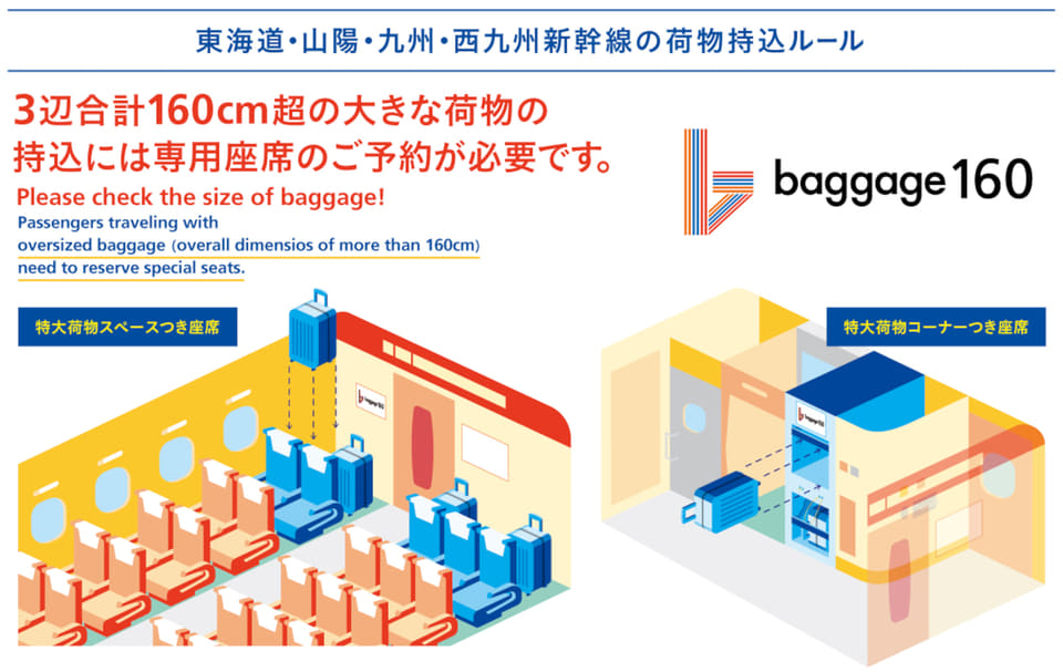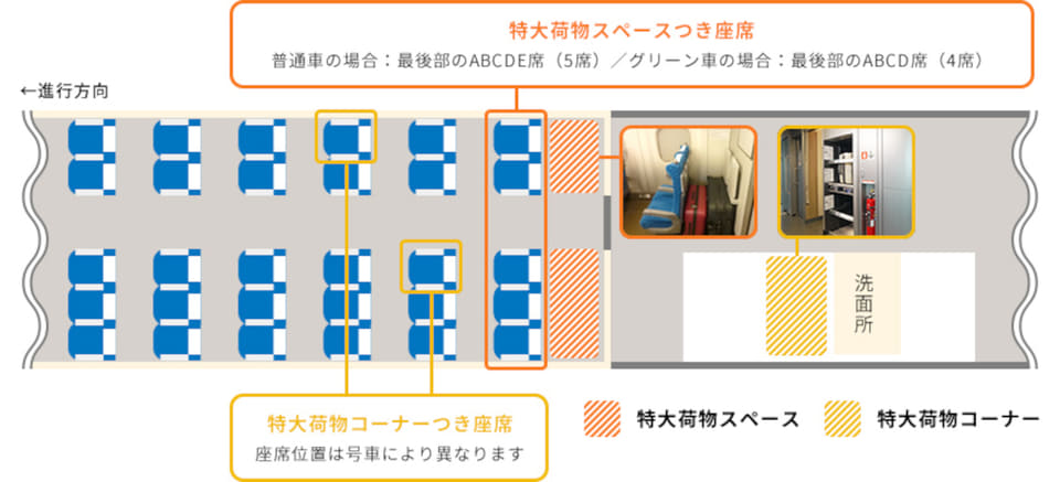 なお、北海道・東北・秋田・山形・上越・北陸新幹線に特大荷物持ち込み用の席はなく、車内にある荷物置場は予約なしで利用できる。
