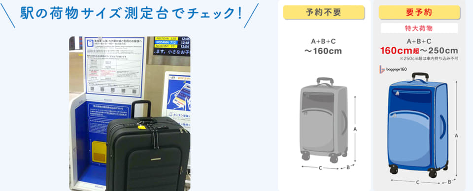 3辺合計が250cm以上の荷物はそもそも車内に持ち込みできないため、心配な人はきっぷを買う前に測るのがお勧め。主要な新幹線駅では、きっぷうりば付近やみどりの窓口に荷物サイズ測定台も設置している。