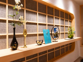 富山城にほど近い立地で、夜間には城のライトアップも見られるロケーション。館内は、木の格子を組み合わせた和風のデザインとなっている。