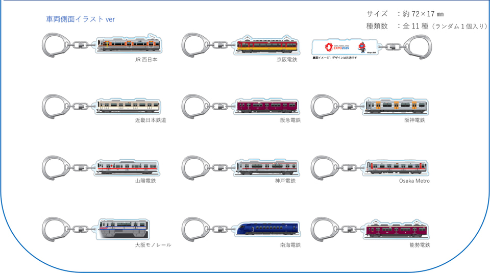 関西の鉄道会社11社は、2025大阪・関西万博公式ライセンス商品として、各社の鉄道車両や大阪・関西万博のラッピング車両をモチーフにしたコラボグッズ「EXPO2025&Kansai Area Trains」(全13種類)を発売する。