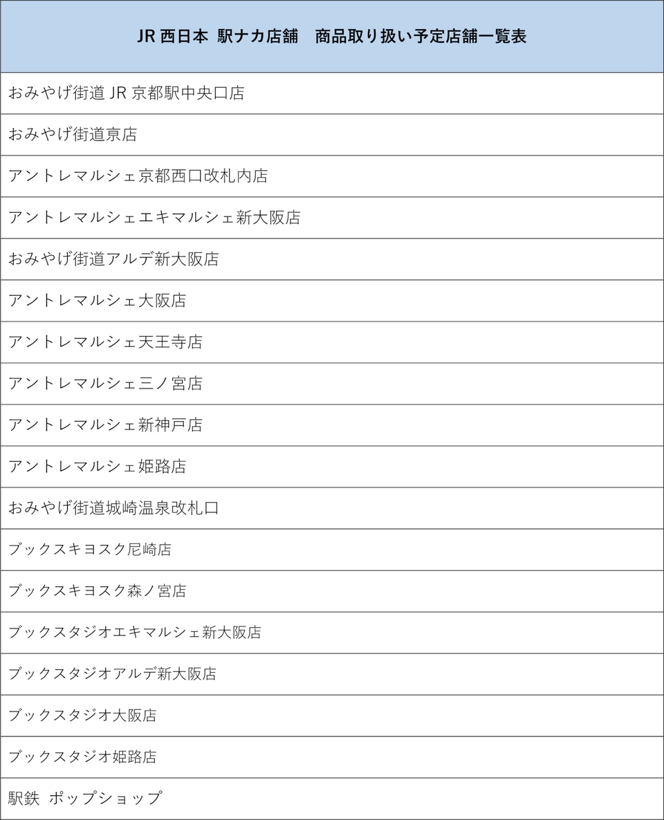・JR西日本 駅ナカ店舗(おみやげ街道、アントレマルシェ、ブックキヨスク、ブックスタジオ、駅鉄ポップショップなど)