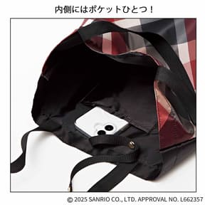 前面は、ブランドを象徴するクレストブリッジチェック柄にキティちゃんとりぼんをあしらったデザイン。背面はブラック一色になっており、シックな秋コーデにも〇。内側には小物ポケットが1つ備わる。