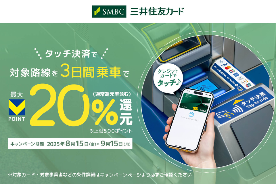三井住友カードは、「タッチ決済でお得に乗車!対象路線を3日間ご利用で最大20%還元キャンペーン」を実施している。