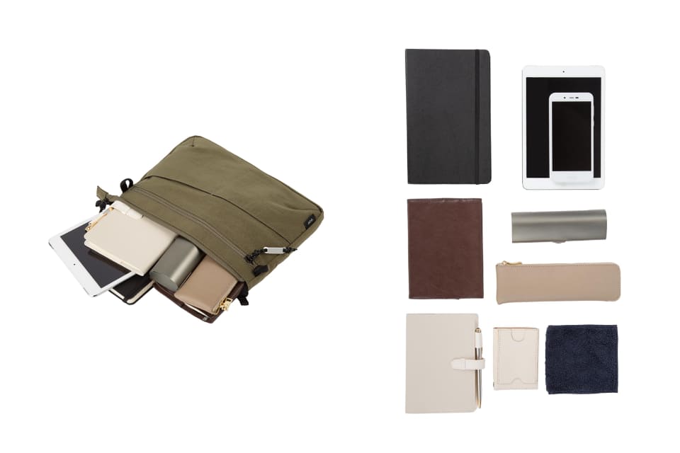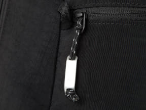 自然なシワ感とハリ感のあるワッシャー加工のナイロン生地と、撥水・撥油性に優れたテフロン加工で機能性と見た目の美しさを両立した。フロントポケットには軽量なオリジナルアルミ引手を配し、アウトドアライクなアクセントを添えている。