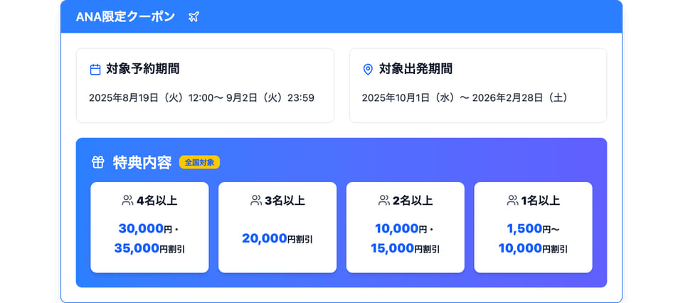 また、JAL/ANA便の利用限定で最大3万5000円引きとなるクーポンを配布し、さらに旅行代金5%分(LYPプレミアム会員は10%分)のPayPayポイントを追加付与するキャンペーンも実施する。今回のセールプランにJAL/ANA便限定クーポンとたまったポイントを併用することでよりお得になるという。
