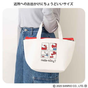特別付録は、ハローキティのトートバッグと保冷ポーチのセット。トートバッグは白地にキティの日常を4コマ風に描いたデザインで、近所へのお出かけにちょうどいい約20.5×16×21cm(底幅×奥行き×高さ)。保冷ポーチは、リボンで顔を隠すおちゃめな姿かわいらしく、バッグインバッグにしてランチトートにするのはもちろん、それ単体で使っても〇。