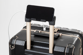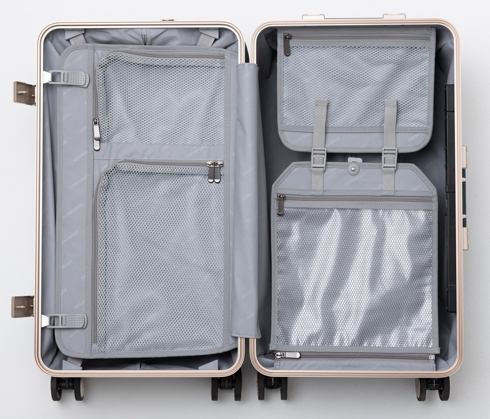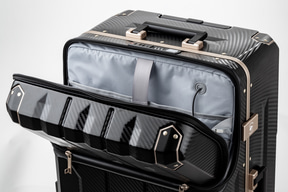 小物が傷付きにくいフロントオープン、スマホスタンドとUSBポート装備のスーツケース「APOLLON(アポロン)」