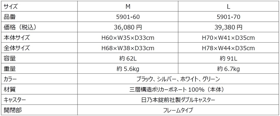 カラーはブラック、シルバー、ホワイト、グリーンの4色で、各色Mサイズ(5~7泊向け)とLサイズ(7泊以上向け)の2サイズ展開。価格はMサイズが3万6080円、Lサイズが3万9380円。