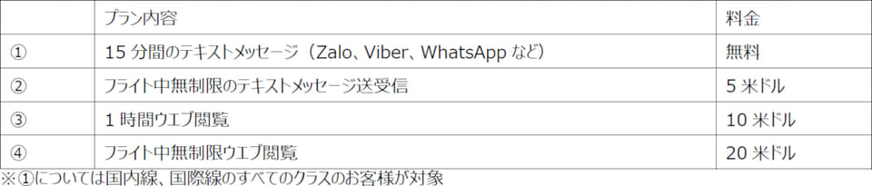 米国・ViaSatのインターネット接続衛星システムを搭載した一部機材が対象で、国内線・国際線の全クラスでは15分間のテキストメッセージ(Zalo、Viber、WhatsAppなど)が無料で利用可能。国際線では3種類の料金プランを用意し、フライト中無制限のテキストメッセージ送受信(5米ドル)、1時間Web閲覧(10米ドル)、フライト中無制限Web閲覧(20米ドル、ビジネスクラス搭乗客は2025年12月まで無料)から選べるようにした。なお、2026年中にはすべての同型機にサービスを拡大し、今後は決済方法や利用プランの選択肢も増やす予定としている。