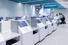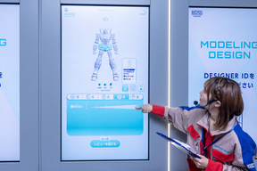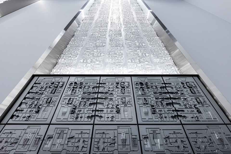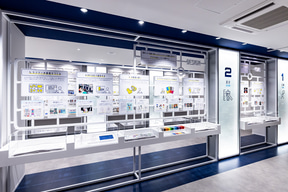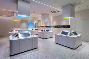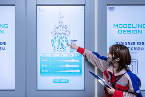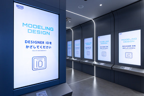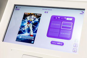4000体のガンプラが並ぶエリアを過ぎると体験コーナーがある「ラボラトリーエリア」。体験用IDカード「DESIGNER ID」を使って「モデリング」を行ない、そのデータを「カラーリング」「モールド」「インジェクション」「パッケージデザイン」と進みつつ自分だけのプラモを製作していく。自分で作ったパッケージデザインのシールは印刷されるので、ミュージアム限定の成形品と一緒に持って帰ることが可能。最後のプラモデル展示エリアには限定グッズが購入できる自販機も用意している。