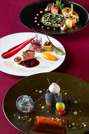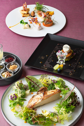 ハタ、イセエビ、鮑から選べる海鮮メニューをはじめ、牛フィレ肉のソテーなど食べ応えのあるコース内容が特徴。ハロウィーンカラーや、ゴーストモチーフがデコレーションしたデザートなど、ハロウィーン気分を盛り上げるコースだ。