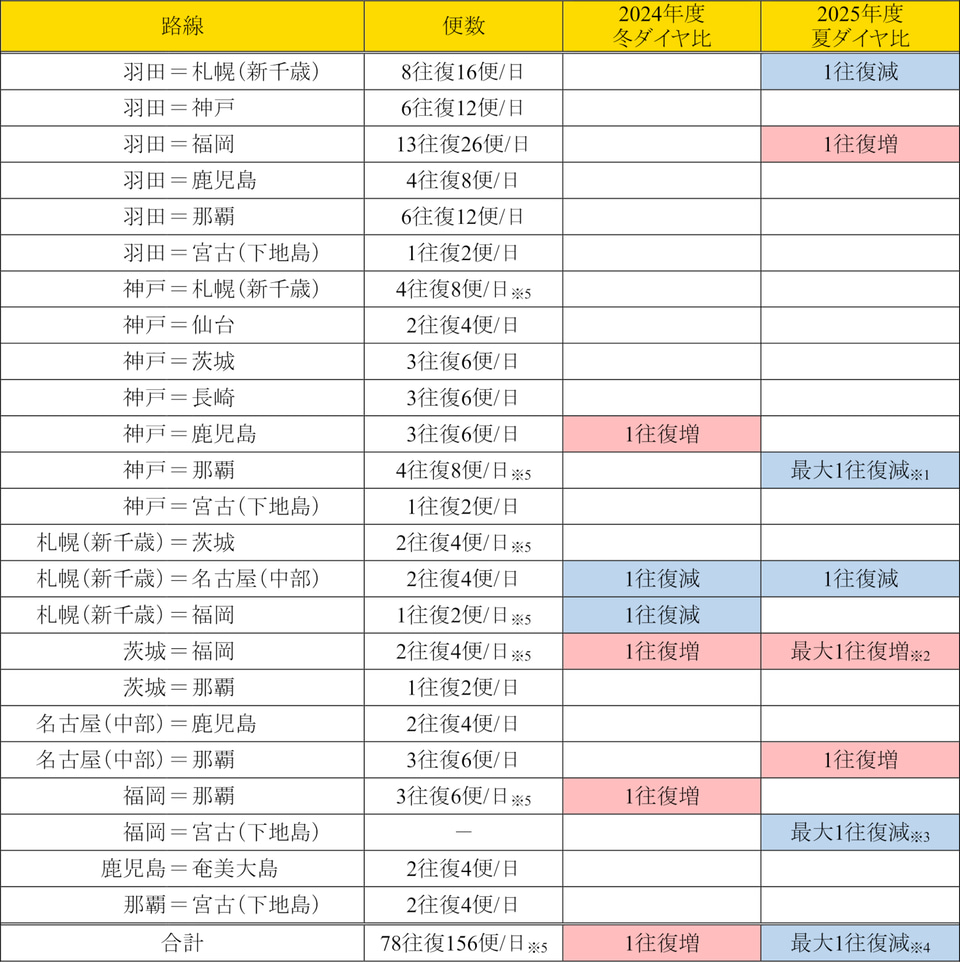 仙台~那覇線は、神戸乗り継ぎ便を復活。福岡~那覇線、茨城~福岡線、神戸~鹿児島線は、2024年度冬ダイヤと比較して1往復増便となる。
