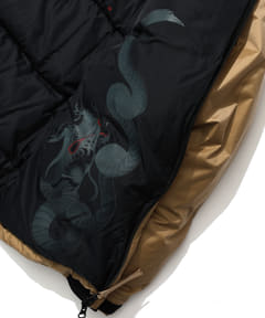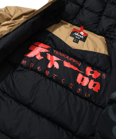 第2弾は、防水性と透湿性を両立させたナンガ独自の高機能素材「オーロラテックス」の生地に、天下一品の“こってりスープ”を思わせるベージュカラーを採用したダウンジャケット。シックな黒い裏地には「明日も着てください。」のメッセージをプリントし、京都・桜凛堂一筆龍絵師の手島氏が描いた黒の一筆龍をあしらう。袖口にさりげなく施した「NANGA×天下一品」の刺繍もポイントという。