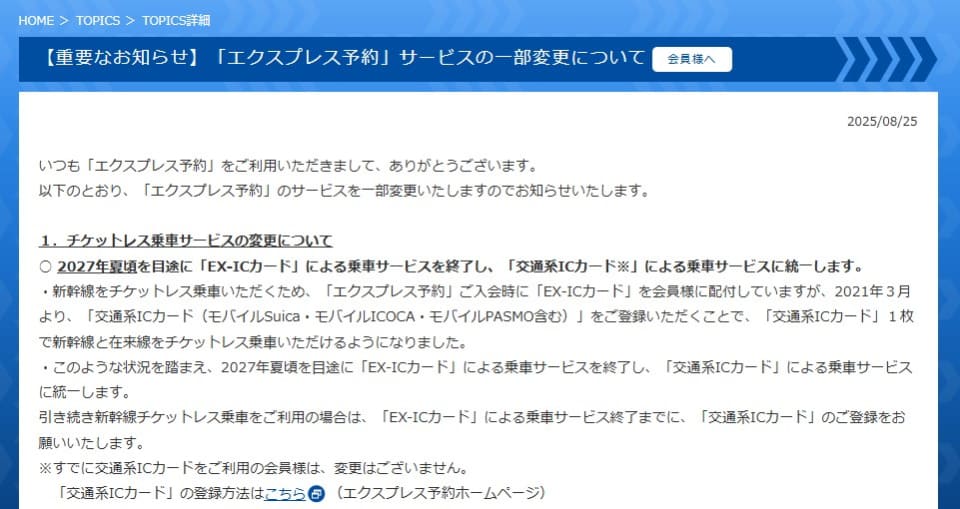 乗車方法の統一に伴い、2026年夏ごろにEX-ICカードの新規発行および再発行の受付を終了し、エクスプレス予約の会員登録の手続き方法が変更となる。