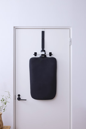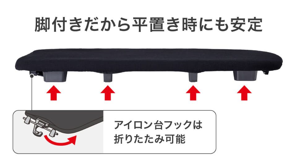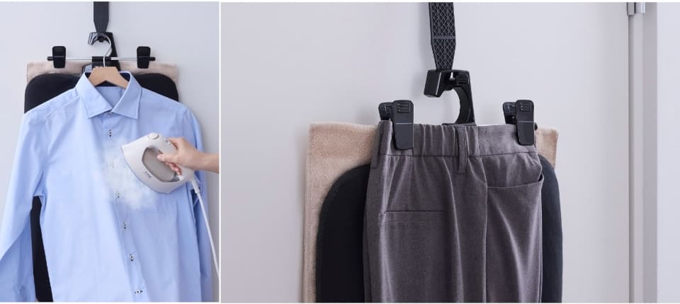 付属の専用ドアフックと組み合わせることで、クローゼットや部屋の扉に取り付けて使用できるほか、ボード上部の引っ掛けを折りたたむことで、平置きのアイロンボードとして衣類のプレスにも対応する。