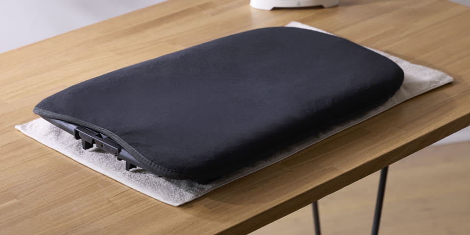 衣類スチーマーとアイロンの両方に対応したアイロンボード。ボード上部の引っ掛け部分にはハンガーを吊るせるフックが張り出しており、衣類をハンガーにかけたまま、吊り下げた状態でスチームがけができる。また、クリップも備えているため、スラックスやスカートのシワ伸ばしにも便利とのこと。