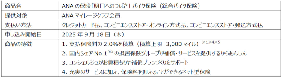 ANA、マイルが貯まるバイク保険「明日へのつばさ」発売