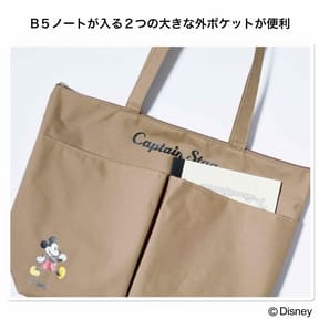特別付録は、ミッキーマウスとアウトドアブランド「キャプテンスタッグ」がコラボしたBIGトートバッグ。14インチPCも入る大容量サイズで、約44.5×12×33.5cm(上部幅×奥行き×高さ)。フロントには、B5ノートが入る大きなポケットが2か所備わる。