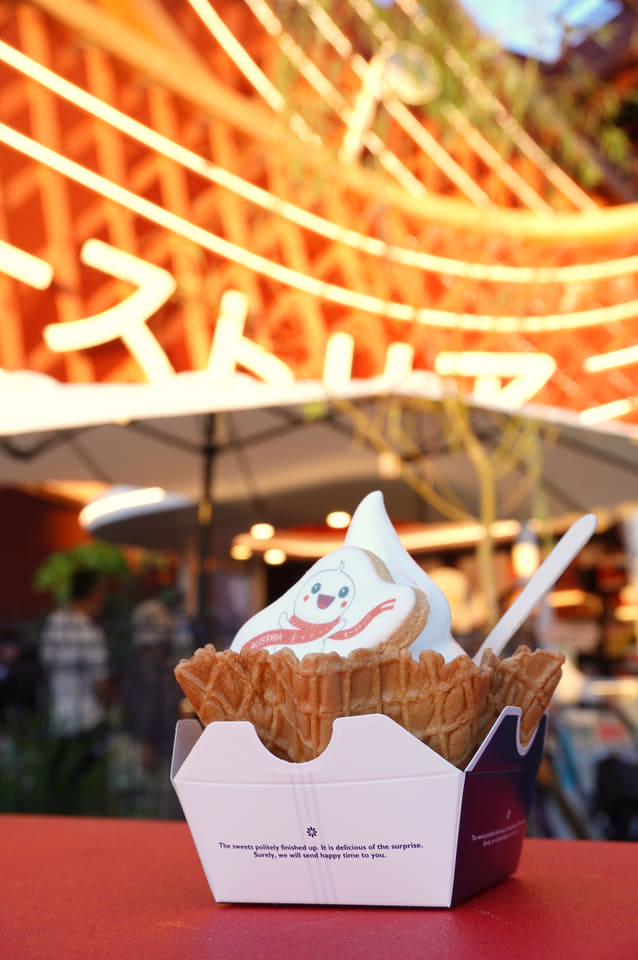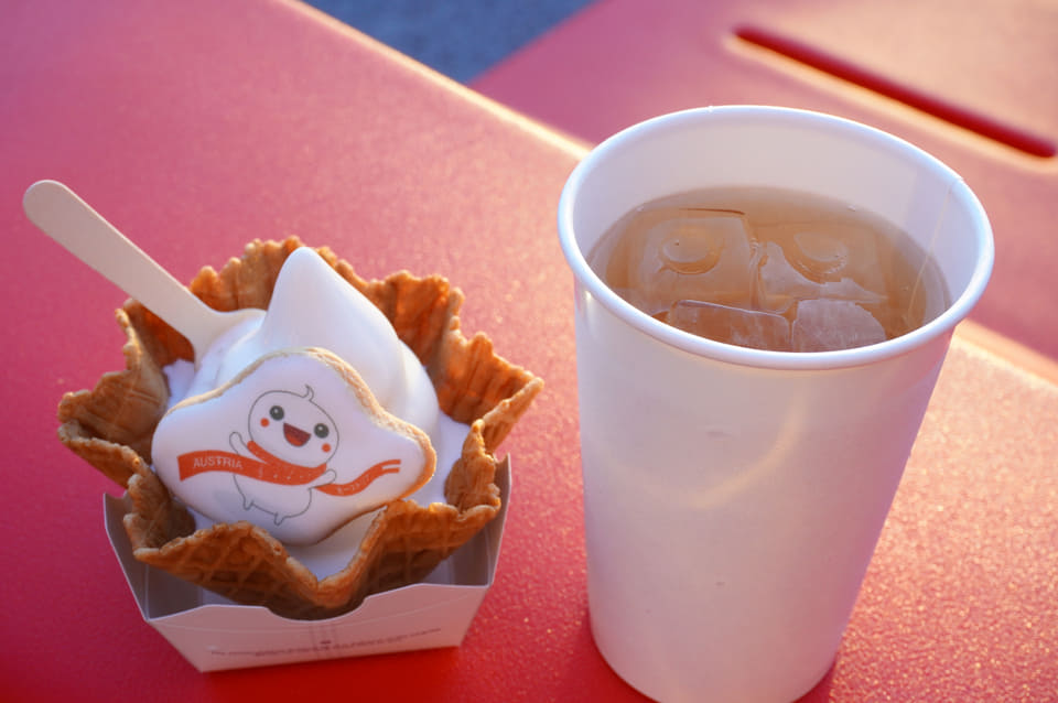【万博グルメ】夜まで販売しているオーストリア館のソフトクリーム(はちみつがけ)がほてった身体に染みわたる!