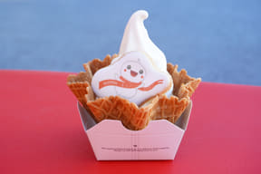 ソフトクリームがのっているワッフルコーンは大きめで食べ応えがあり、さらに公式キャラクター「赤白赤ちゃん」のアイシングクッキーも添えられているので、おやつにしてはこれ1品でも満足感が得られる。