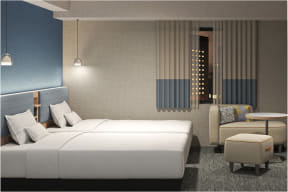 客室はクイーンエコノミー(69室)、ツインスタンダード(51室)、ユニバーサルルーム(2室)の3タイプ。全室禁煙としており、いずれも独立したバスとトイレに加え、チョイスオリジナルの寝具を設える。ベッド横にはコンセント類を設置しており、USB Type-Cにも対応する。