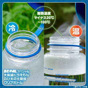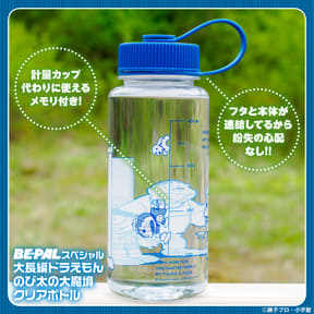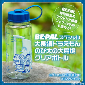 今年45周年を迎える大長編ドラえもんシリーズのなかでも、アウトドア好きに人気がある「のび太の大魔境」をモチーフにしたクリアボトルと、BE-PAL特別編集「アウトドア探検ブック(電子版)」が読める2次元バーコードがセットになっている。