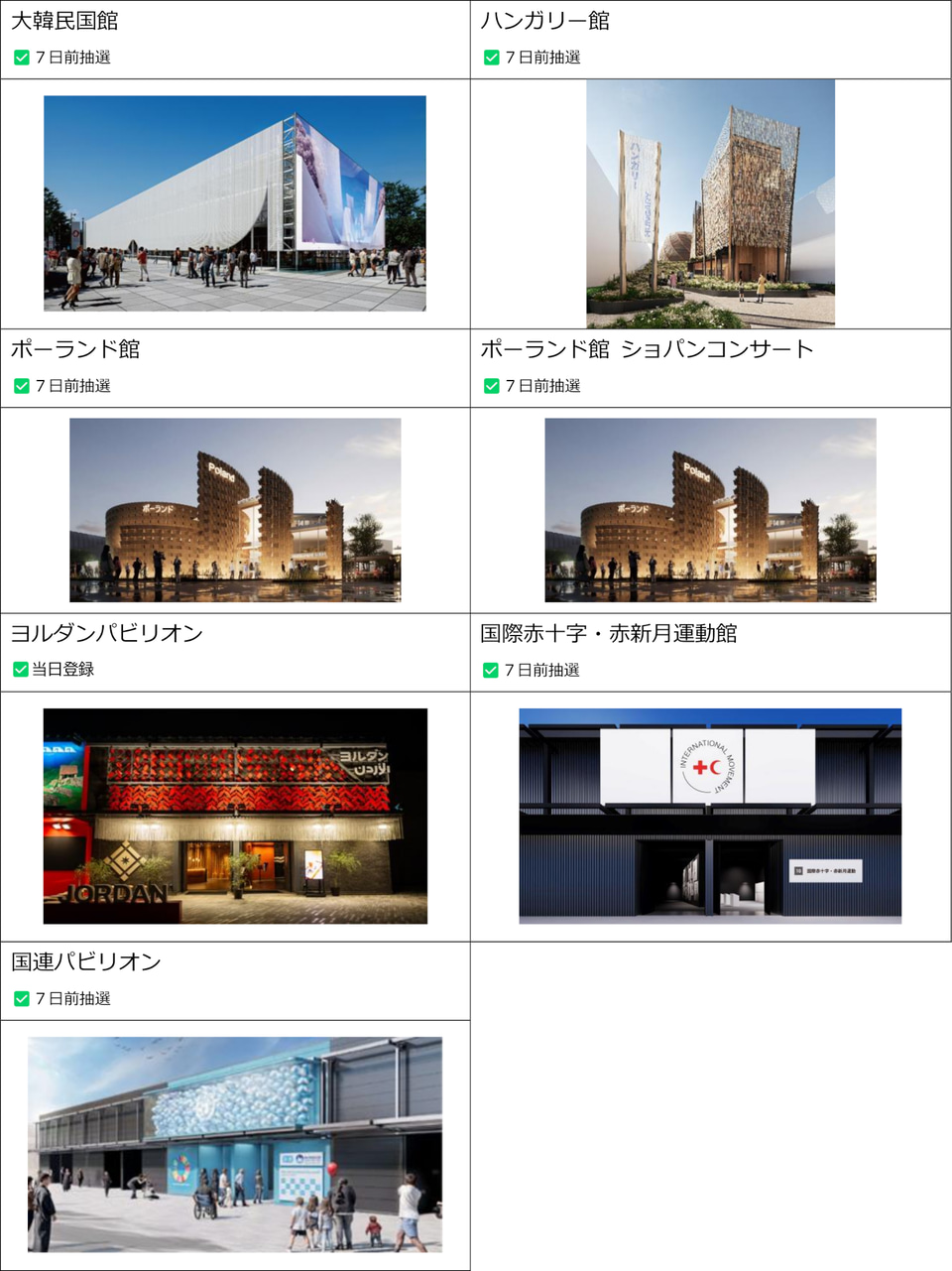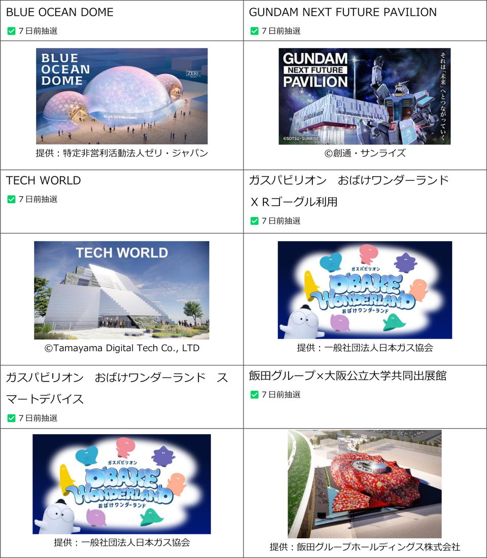 今回更新したリストには、7日前抽選や当日受付の対象となるパビリオンの情報をまとめて掲載している。