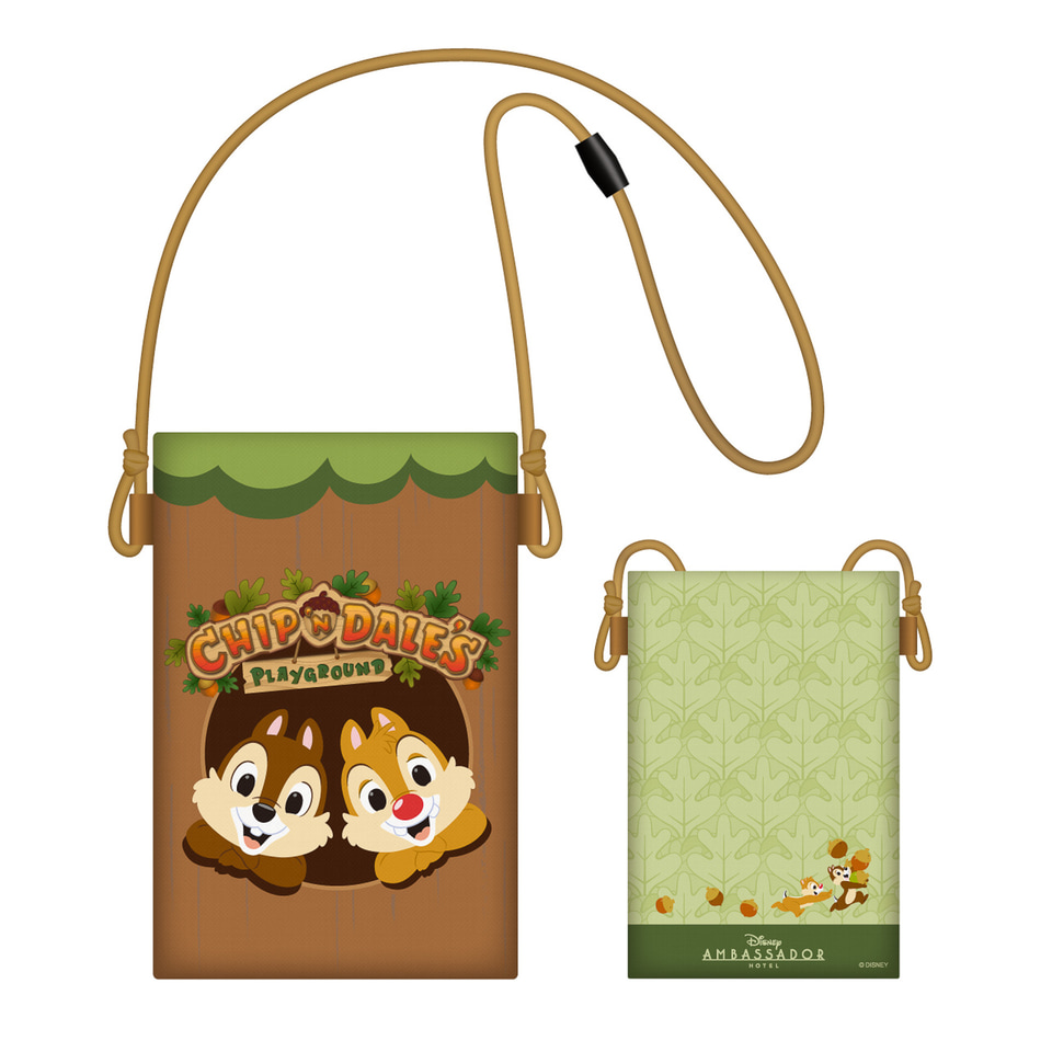チップとデールのプレイグラウンドをモチーフにした「ポシェット」も提供中。パーク滞在に使い勝手のよいサイズ感で、チップとデールの笑顔がフロントに、バックにはナッツを運ぶ彼らの姿を描いている。