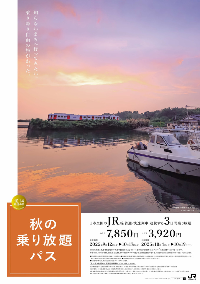 JRグループは、10月14日の「鉄道の日」に合わせて、2025年度も「秋の乗り放題パス」および「秋の乗り放題パス北海道新幹線オプション券」を発売する。発売期間は9月12日~10月17日、利用期間は10月4日~19日で、価格は大人7850円・子供3920円。