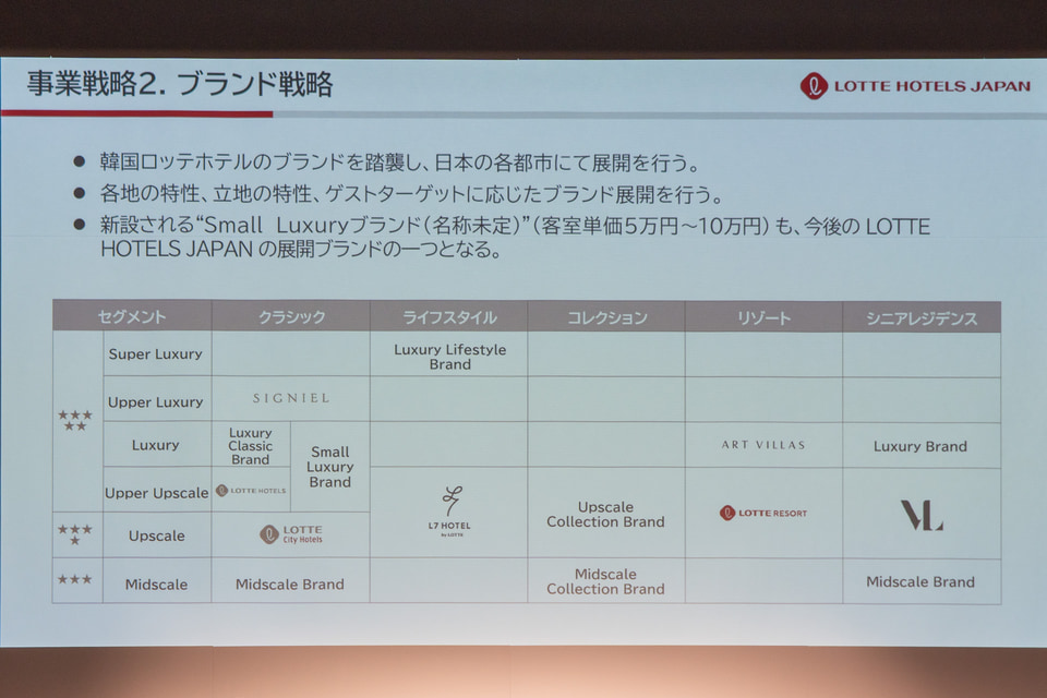 会見に登壇したLOTTE HOTELS JAPAN 代表取締役社長の福井朋也氏は、新設する客室単価5万~10万円のスモールラグジュアリーブランド(名称未定)も国内展開を見込んでいると説明したほか、韓国で50年以上培ったホテル事業のノウハウに、日本での製菓事業の知名度をかけ合わせて、国内ではウェルネス活動に力を入れる、と述べた。