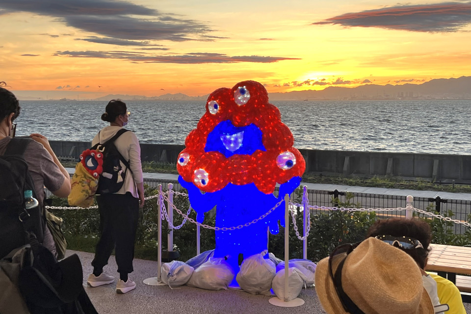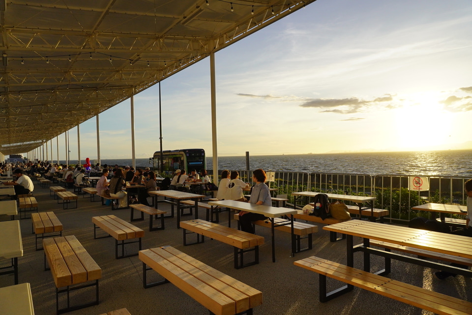 気温は30℃を超えていたが、大阪湾に面しているテラスはわずかに風が吹いていてかなり涼しかった。西の果てなので大屋根リングからはやや距離があるものの、イルミネーションミャクミャクとの2ショットも楽しめるので、夕食やミャクミャクくじついでに立ち寄ってみてはいかが?