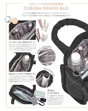 コスメオタク編集者が本気で作ったビューティブランド「ブリルミー」の新作。仕切り付きでスムーズに整理整頓でき、使いやすさにこだわった多機能ポケットが特徴。リップやマスカラなどのメイク道具もそのまま収納できる縦長ポケット、収納したものが分かりやすいメッシュポケット、両サイドのスマホポケット、倒れる心配がない600mLペットボトルホルダー、失くしたくない鍵やパスポートをしまえるジップポケットが備わる。