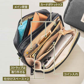 増刊号は「紀ノ国屋」とコラボした2層式お財布ショルダーバッグが付録。サイズは約11×18.5×5cm(幅×奥行き×高さ)。メイン収納とは別に、お財布スペースを設けており、カードポケット3か所、ファスナー付きのコイン入れ1か所、お札やスマホ入れに適した仕分けスペース2か所を備える。