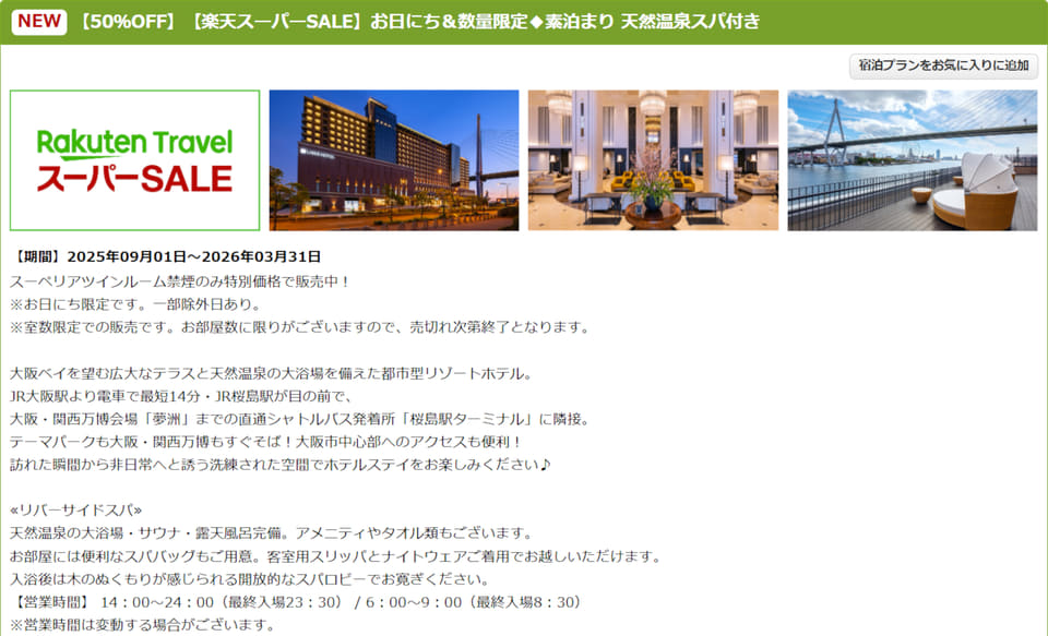 リーベルホテル大阪、素泊まりプランが50%オフ。天然温泉スパ付き、USJ&万博もすぐそば