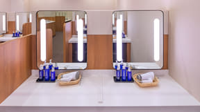 館内には天然温泉の大浴場・サウナ・露天風呂を備え、アメニティやタオル類も完備している。