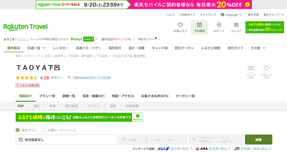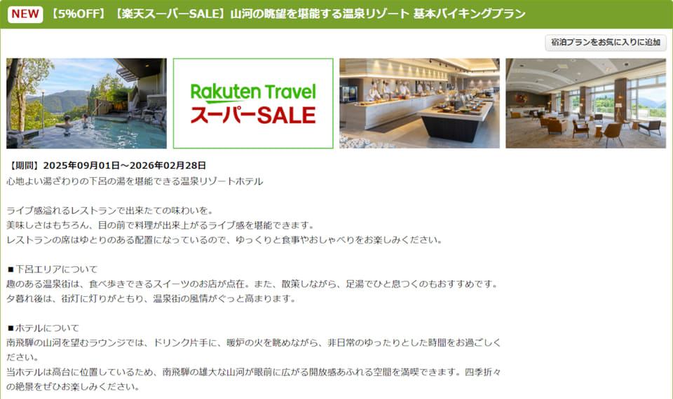 楽天トラベルは、秋冬の旅行予約がお得な「楽天トラベル スーパーSALE」を9月20日23時59分まで開催している。全国のホテルや温泉宿が最大20%オフ(セールプラン+クーポン併用)になるほか、一部施設で半額以下プランも登場。
