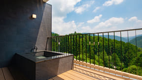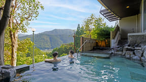 南飛騨の山々と河に囲まれた眺望自慢の宿で、大浴場と露天風呂は豊かな緑を望む「深層の湯」と下呂温泉街の夜景も美しい「層雲の湯」を男女入れ替えで楽しめる。また、夕食時やラウンジで提供されるドリンクなど、館内サービスがほぼ宿泊料金に含まれるオールインクルーシブ制を導入しており、ビールやワインなどのお酒も飲み放題。