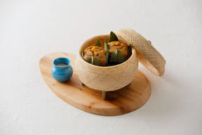 ココナッツミルクが香るカンボジアの伝統的な蒸しケーキで和栗あんをたっぷり包み、栗の葉で巻いたスイーツ。価格は1個850円、原宿の「HOW'z」(東京都渋谷区神宮前6-31-21 東急プラザ原宿「ハラカド」3階)で販売。