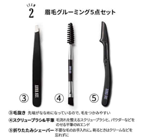 美眉をつくるのに欠かせない厳選アイテムたちは、ハサミ、ブラシ&コーム、毛抜き、スクリューブラシ&平筆がラインアップ。シックな黒にロゴをあしらった統一感もポイントになっている。