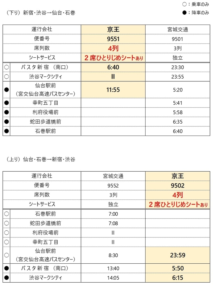 夜行便: 仙台駅前(23時59分)発~バスタ新宿(05時50分)着~渋谷マークシティ(06時15分)着