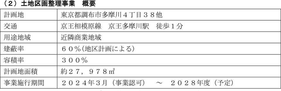 本開発エリアは、旧京王フローラルガーデンアンジェ跡地など約2.8ヘクタールの敷地および京王多摩川駅と駅高架下を含む範囲を対象とするもの。