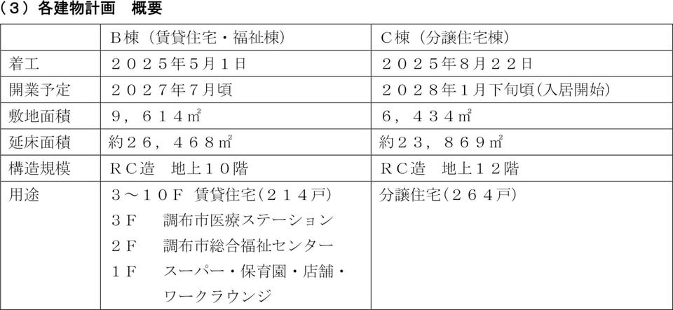 土地区画整理事業の施工期間は、2024年3月(事業認可)~2028年度(予定)。地上10階のB棟は2027年7月ごろ開業予定で、賃貸住宅(214戸)のほか、調布市医療ステーションや総合福祉センター、スーパー「京王ストア」、認可保育園、飲食店舗、ワークラウンジを設ける。地上12階(分譲住宅264戸)のC棟は、2028年1月下旬ごろ入居開始とのこと。A棟の建物計画は未定となっている。