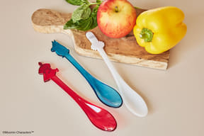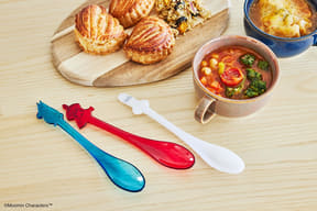 物語に登場する3キャラクターが、青・赤・白の色鮮やかでかわいいスプーンになって登場。ガラスのような美しさながら、軽くて丈夫で持ちやすく、口あたりがなめらかなのも特徴で、子供の食事にも使える。また、耐熱・耐冷、食洗機に対応する。
