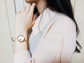 「Suicaのペンギン」バングルタイプの腕時計。シルバー・ピンクゴールドの2色展開、ひねるだけで着用できる