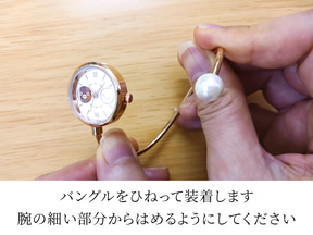 イミテーションパールが華やかさを演出し、日常使いから特別な日まで幅広く活躍するほか、プレゼントにも最適としている。ケースサイズは約23.5×23.5mm(リューズを除く)、バンドの内径は約160mm。防水機能はなしで、日本メーカー製ムーブメントを使用している。
